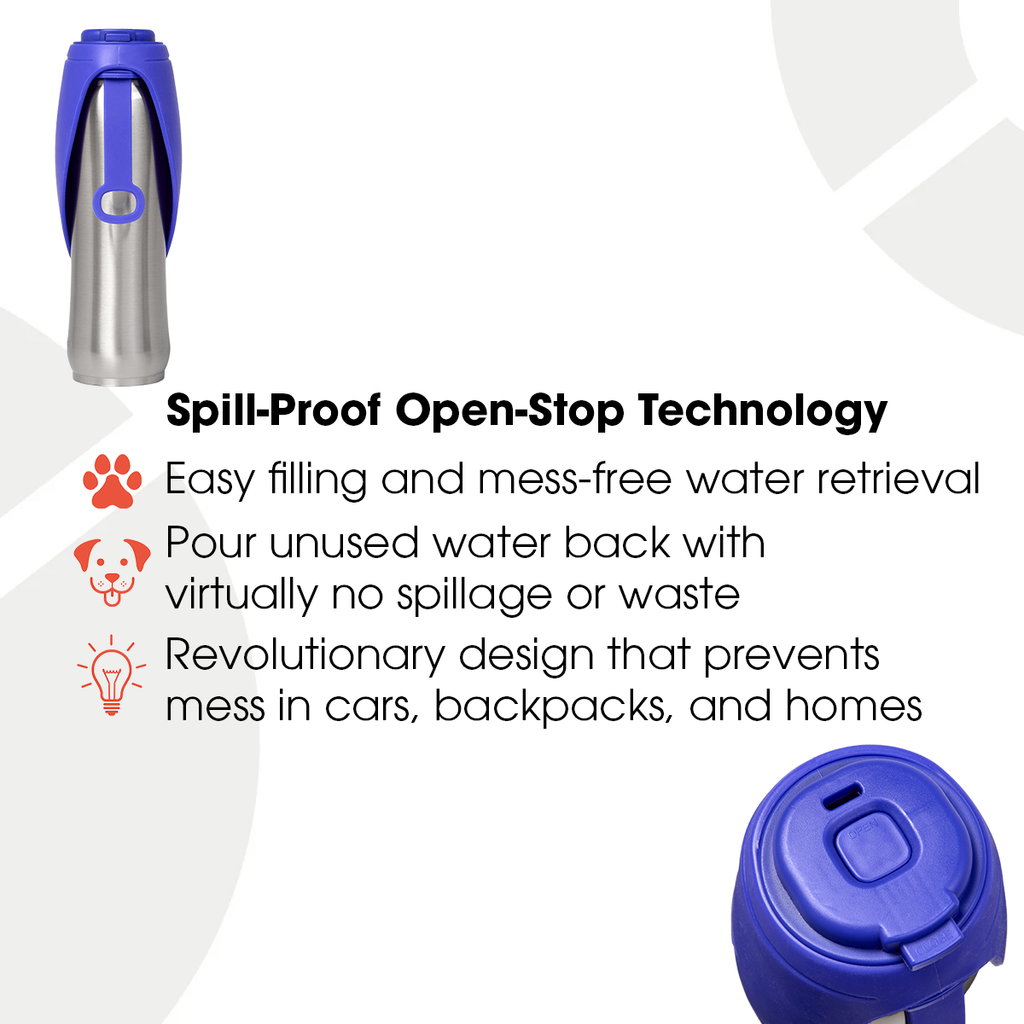 Whether you're heading out for a short walk or spending the whole day at the beach, your dog will have access to water at just the right temperature - safe and comfortable for drinking. Our innovative spill-proof design lets you pour unused water back into the flask with virtually no spillage, meaning no wasted water and no soggy car seats or backpacks.
